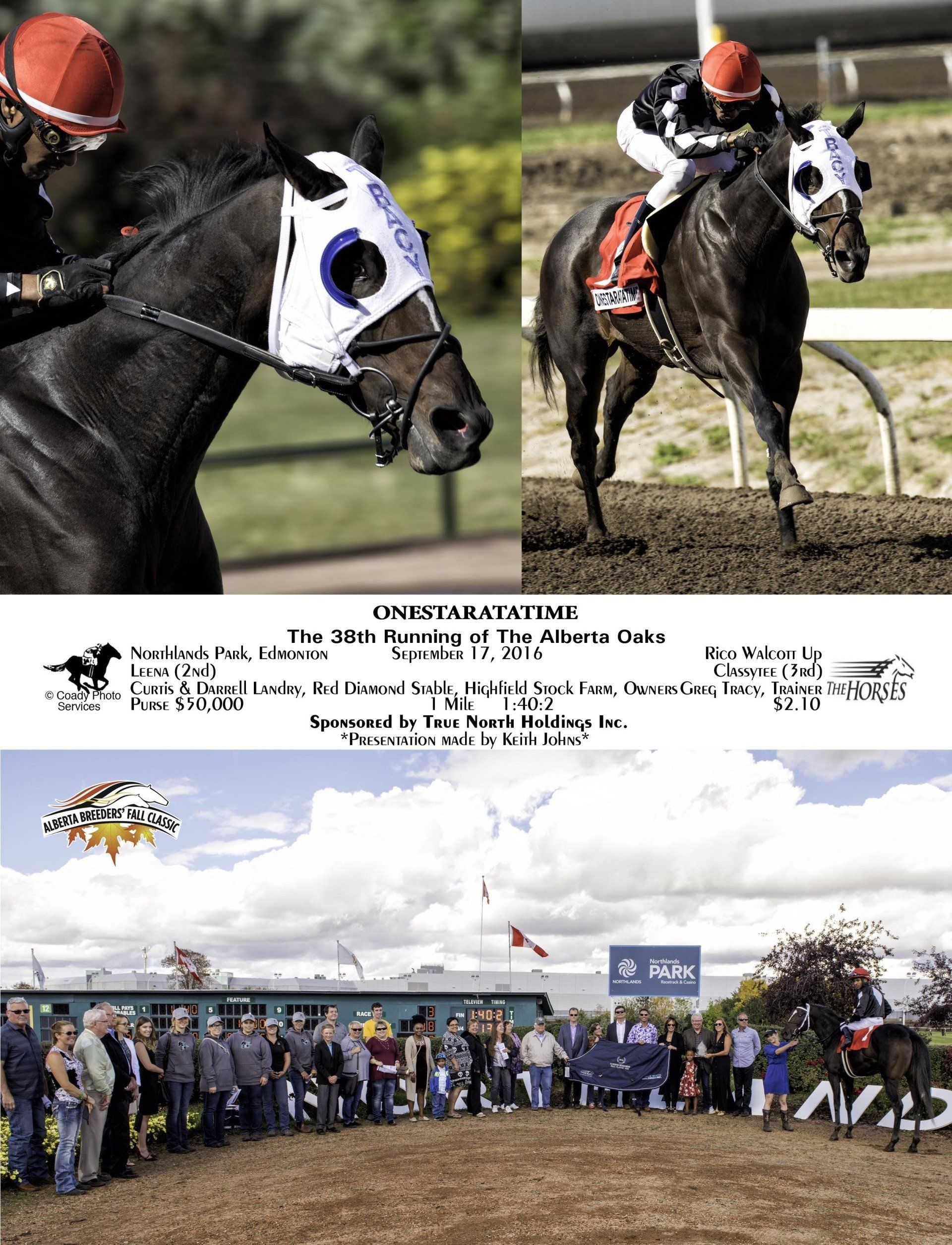 ONESTARATATIME won the first stakes race of the day, the 38th running of the Alberta Oaks for three year old fillies. This graduate of the 2014 Alberta sale is by Cape Canaveral out of Renaissance Woman brought her earnings to $179,443 with this win. The multiple stakes winning filly is shining as a three year old with the Alberta Oaks win giving her a fourth stakes victory in a row. Onestaratatime won the Sonoma, Northlands Oaks and the R.K. Smith Handicap leading up to her win on Fall Classic day. Onestaratatime was bred by Highfield and is owned by Curtis & Darrell Landry, Red Diamond Stable and Highfield. Cape Canaveral has sired 30 stakes winners with progeny earnings of over $16 Million while Renaissance Woman is a successful dam having produced three other winners including the Alberta race mare Alywyn ($261,194).