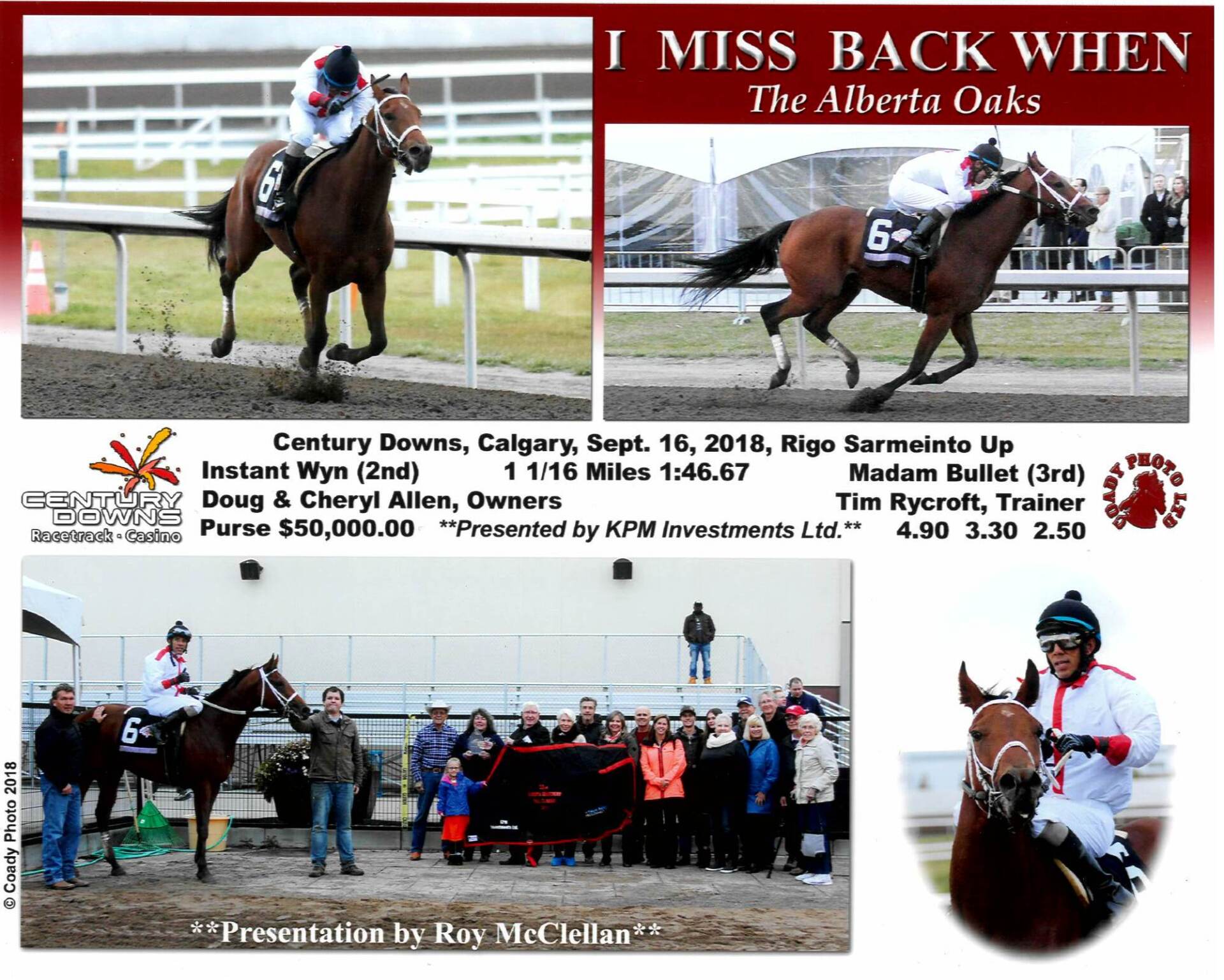 The winner of the $50,000 ALBERTA OAKS for Three Year Old Fillies presented by KPM Investments was I MISS BACK WHEN. This Alydeed filly was bred by Peaceful Valley Farms out of a Dixieland Band mare, Lady Shakin and is owned by Doug and Cheryl Allen. I Miss Back When earned $28,200 for her share of the purse with this win bringing her career total to $77,817. This filly has finished in the placings in all seven of her starts out in 2018.