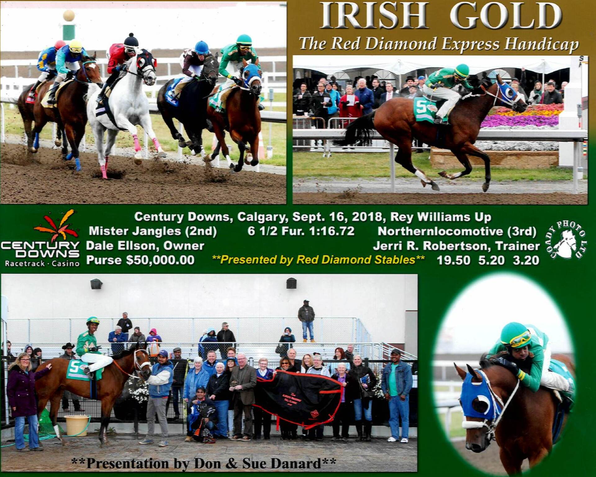 IRISH GOLD was the winner in the $50,000 RED DIAMOND EXPRESS for Three Year Olds and Up presented by Red Diamond Stables. The Dublin gelding captured his first career stakes win and brought his career earnings to $56,697 with the $29,400 share of the first place purse money for this win. The four year old is owned by Dale Ellson and was bred by Bar None Ranches Ltd. out of the Red Ransom mare, Ruby Mist.
