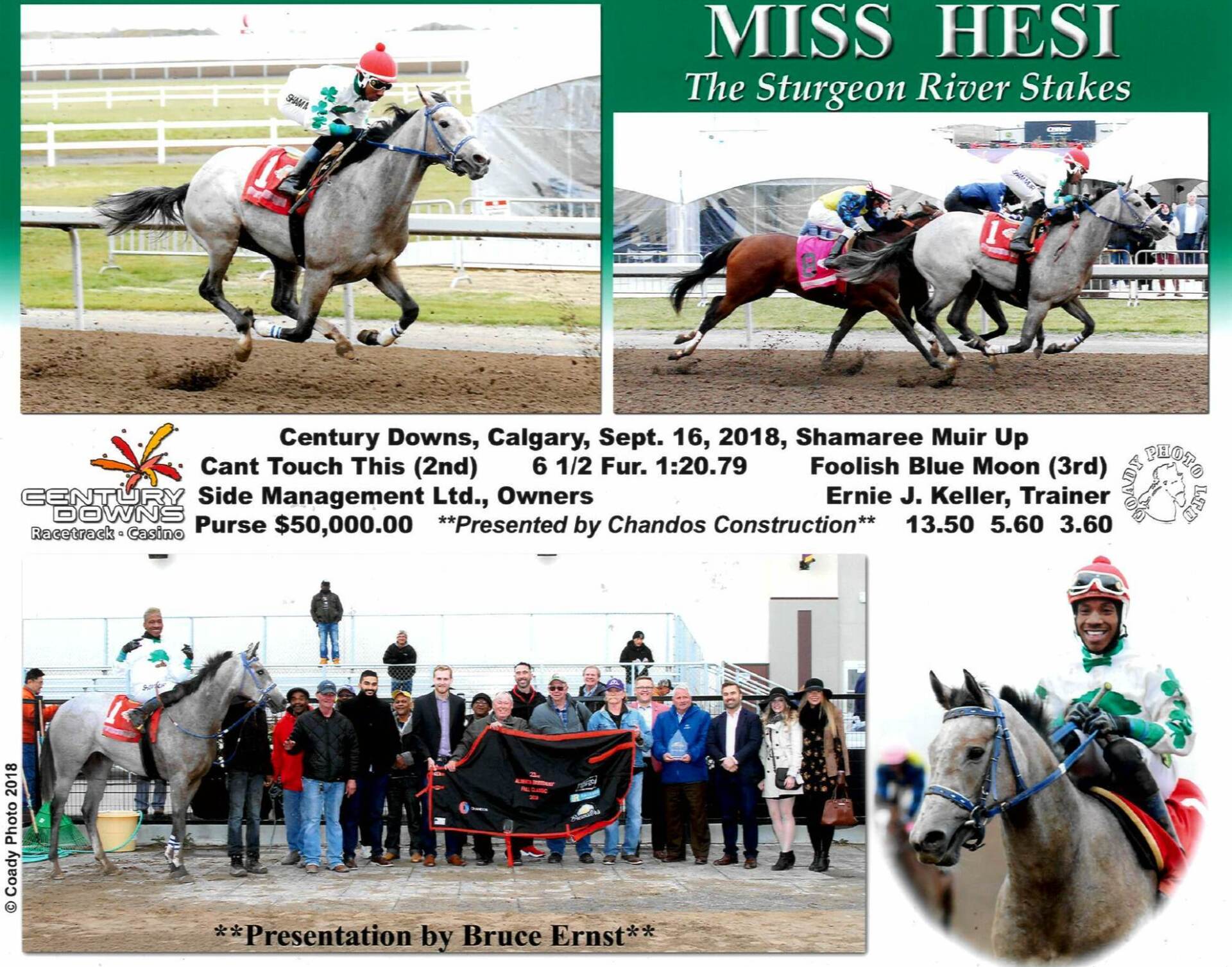 MISS HESI was the winner of the $50,000 STURGEON RIVER for Two Year Old Fillies presented by Chandos Construction. This filly by Canadian Derby winner No Hesitation is bred and owned by Side Management Ltd. out of the Officer mare, Insightofanofficer. Miss Hesi has won an impressive two of three starts in her first season giving her career earnings of $30,087 after adding $28,800 for this first place finish.