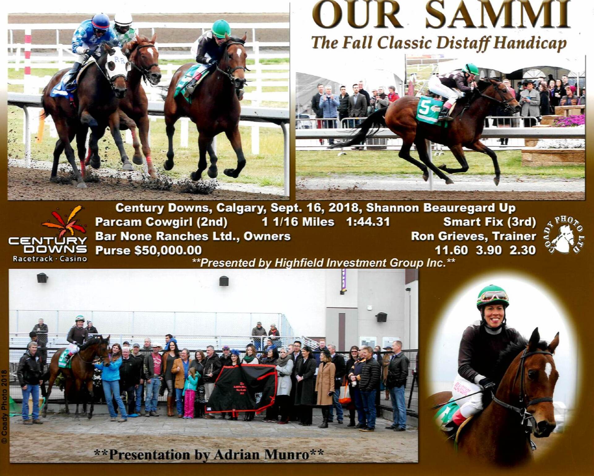 The $50,000 FALL CLASSIC DISTAFF for Three Year Old and Up Fillies & Mares presented by Highfield was won by OUR SAMMI. This four year old Schramsberg filly captured her first stakes win in the Alberta Breeders’ Fall Classic and earned $29,400 with this win for breeder and owner, Bar None Ranches Ltd. Our Sammi has a record of two firsts and a third in four starts out this season and has now brought her career earnings to $44,823. Our Sammi is out of the Seeking the Gold mare, Ensnare.