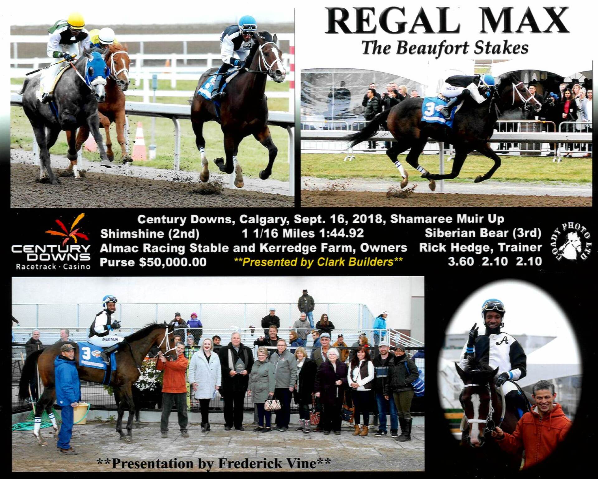 The $50,000 BEAUFORT STAKES for Three Year Olds presented by Clark Builders was won by REGAL MAX. This Max Forever gelding was bred by Stone Ranches Ltd. and is owned by Almac Racing Stable and Kerredge Farm. The multiple stakes placed runner and current Alberta Derby champion added $30,000 to his earnings with this win and now has career earnings of $132,255 with placings in twelve of fourteen lifetime starts. Regal Max is a 2016 CTHS Alberta sale graduate out of the stakes winning Regal Intention mare, My Miss Emily.
