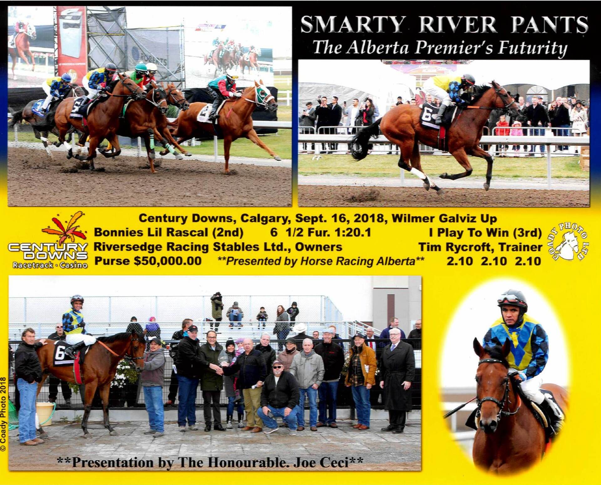The $50,000 ALBERTA PREMIER’S FUTURITY for Two Year Olds presented by Horse Racing Alberta was won by SMARTY RIVER PANTS, bred and owned by Riversedge Racing Stables Ltd. The two year old added the $29,400 winner’s share of the purse to his earnings and now has career earnings of $85,477. This Afleet Alex runner has a perfect record in his first season out with three stakes wins in four starts, including victories in the Princess Margaret Stakes, the Birdcatcher Stakes and this Alberta Breeders’ Fall Classic race. The gelding is out of a stakes placed Smarty Jones mare owned by Riversedge Racing Stables Ltd., Smarty Jill.