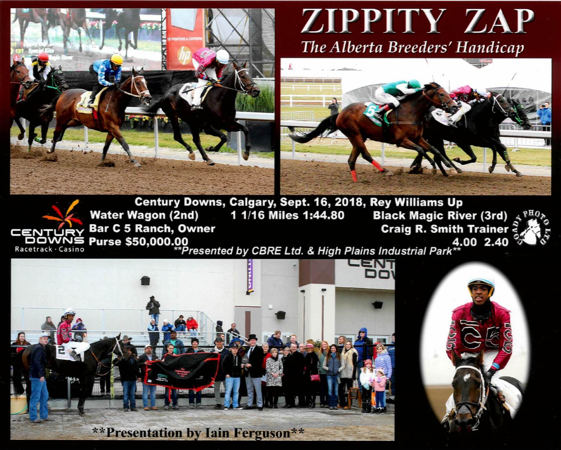 The five year old ZIPPITY ZAP was the winner of the $50,000 ALBERTA BREEDERS’ HANDICAP for Three Year Olds and Up presented by CBRE and High Plains Industrial Park. This Ghostzapper gelding took home the $30,000 portion of the first place purse money for owner Bar C 5 Ranches Ltd. and brought his career earnings to $107,160. The Bar None Ranches Ltd. bred runner is out of a Chester House mare and has placed in three of his four starts this season.