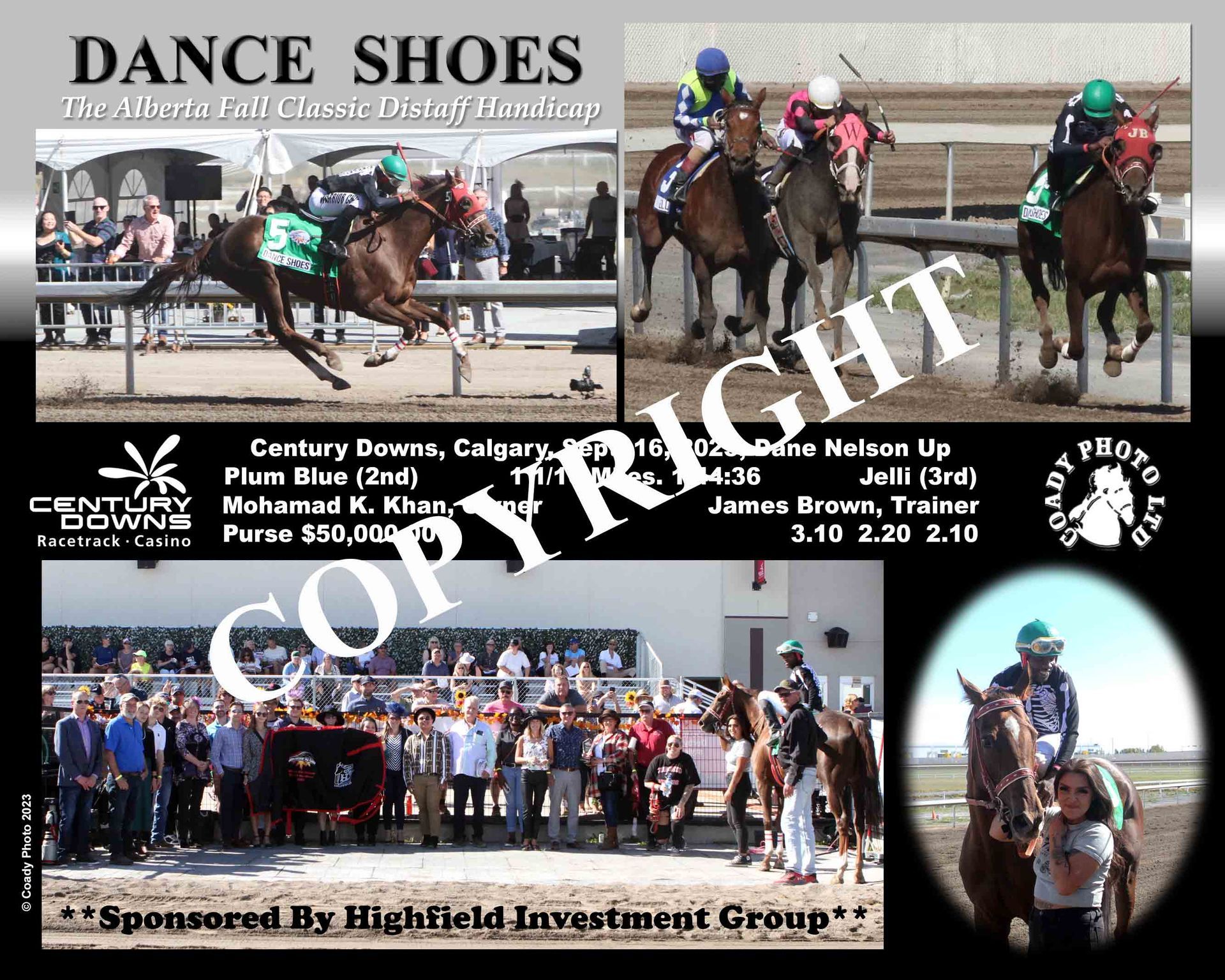 The Alberta Fall Classic Distaff for three year olds and up was handily won by Horse of the Year and Champion Alberta bred, DANCE SHOES. The Mank mare is owned by Mohamad Khan and was bred by James McFadyen. The five year old has earned over US $254,000 and has 33 wins career wins and a record of 33-15-3-7.