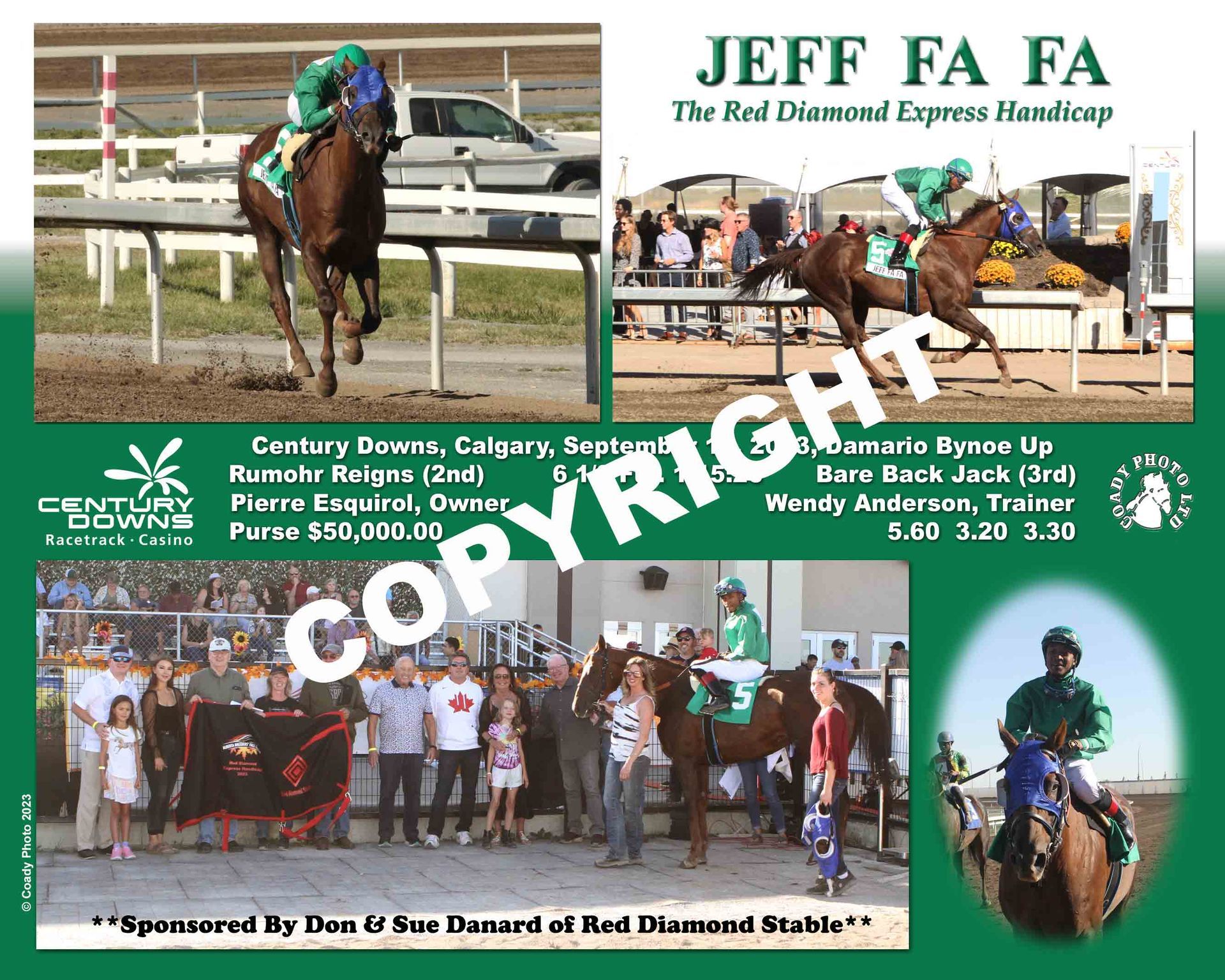 JEFF FA FA was the winner of the Red Diamond Express for three year olds and upwards and set a new track record of 1:15.26 on over six and one half furlongs on the dirt. The Competitive Edge gelding is out of Alamanda Drive and was bred and owned by Pierre Esquirol. This was the fourth straight win for Jeff Fa Fa and the gelding has now has career earnings of over US $69,000 and a record of 13-5-4-2.