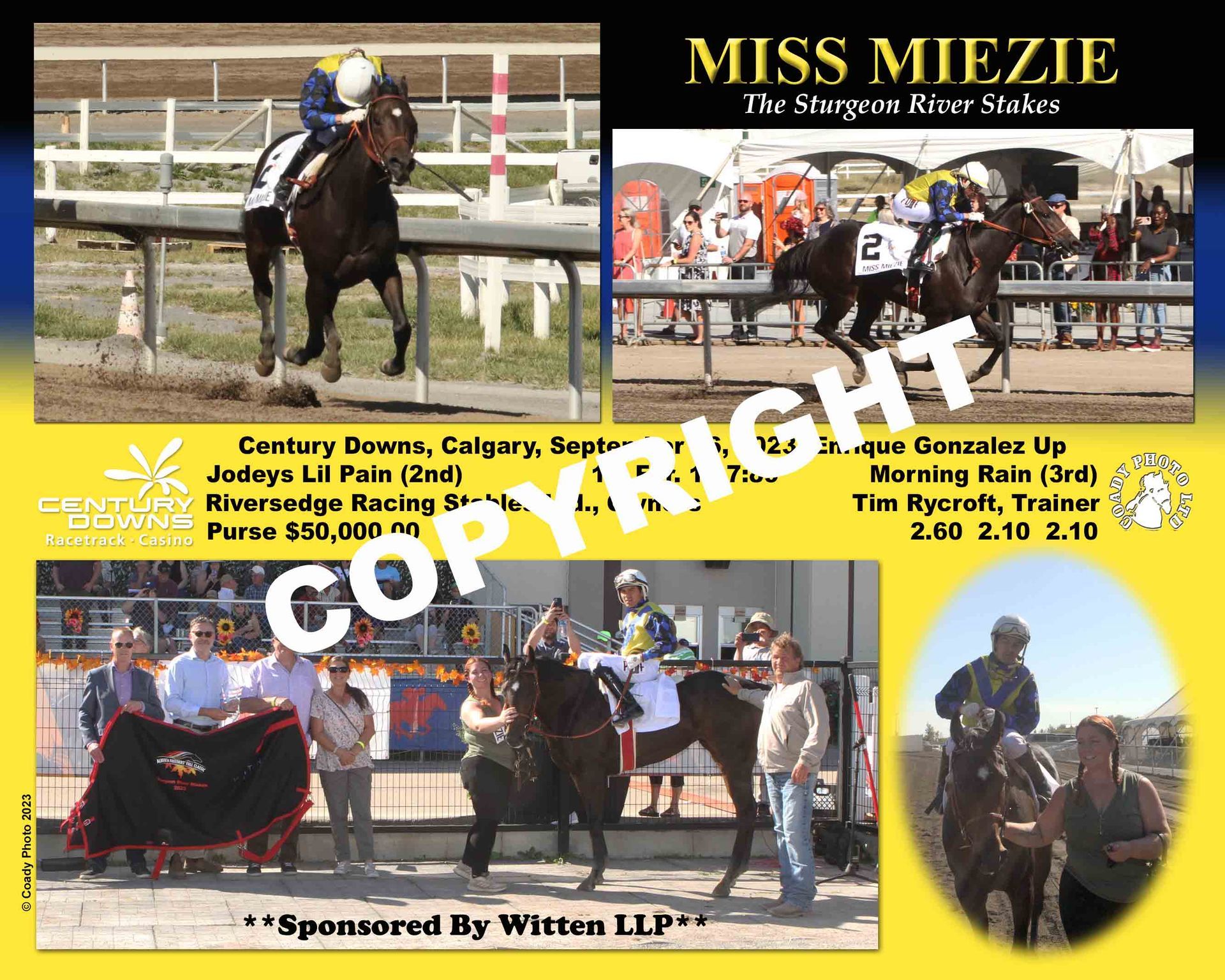 MISS MIEZIE maintained her perfect record with a win in the Sturgeon River Stakes for two year old Alberta bred fillies. Miss Miezie has won all three of her starts this season including this Alberta Breeders’ Fall Classic win and the Princess Margaret Stakes. The filly by St. Patrick’s Day out of Claresmiezie was bred and owned by Riversedge Racing Stables Ltd.