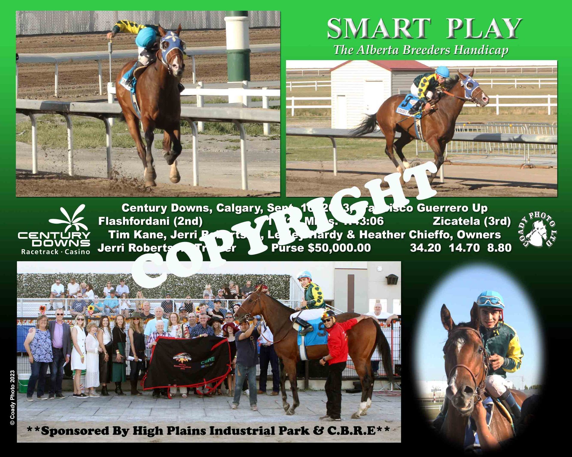 The Alberta Breeders’ Handicap for three year olds and up was won by SMART PLAY. The Smarty Jones gelding has now added this victory to his second place finish in the same race last season. Smart Play was bred by Pierre Esquirol and Jerri Robertson out of the Smile Again mare, Smile Again Theta. The gelding is owned by Tim Kane, Jerri Robertson, Lesley Hardy and Heather Chieffo. Smart Play has earned over US $87,000 and has a career record of 23-4-6-3.