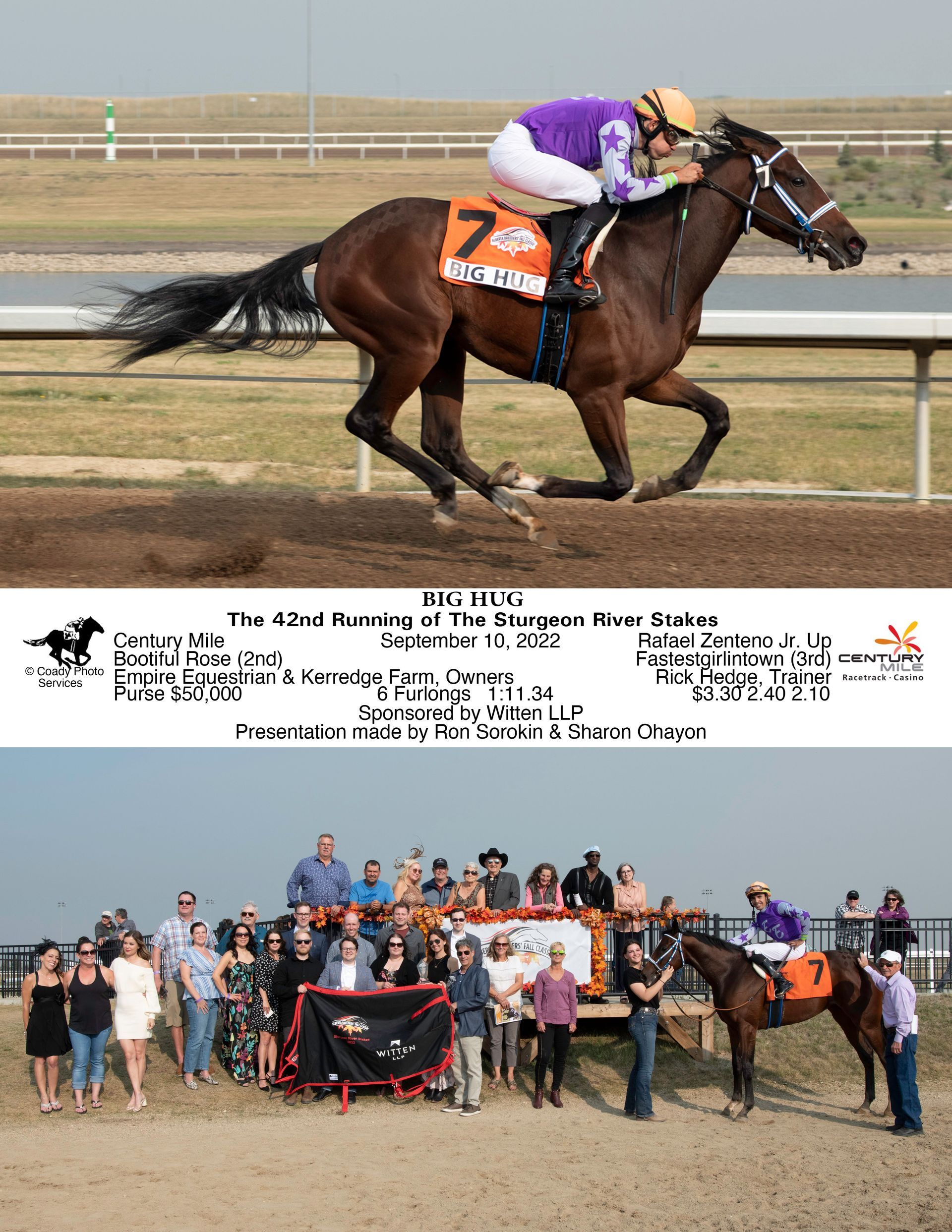 Big Hug remained perfect in three starts winning the six furlong Sturgeon River for two-year-old fillies. A match race from the middle of the turn almost to the finish line, Big Hug, who had won her previous two starts with huge late moves that produced two easy wins, duelled with Bootiful Rose to the sixteenths pole when Big Hug took over for good and drew out to a length and a quarter victory.