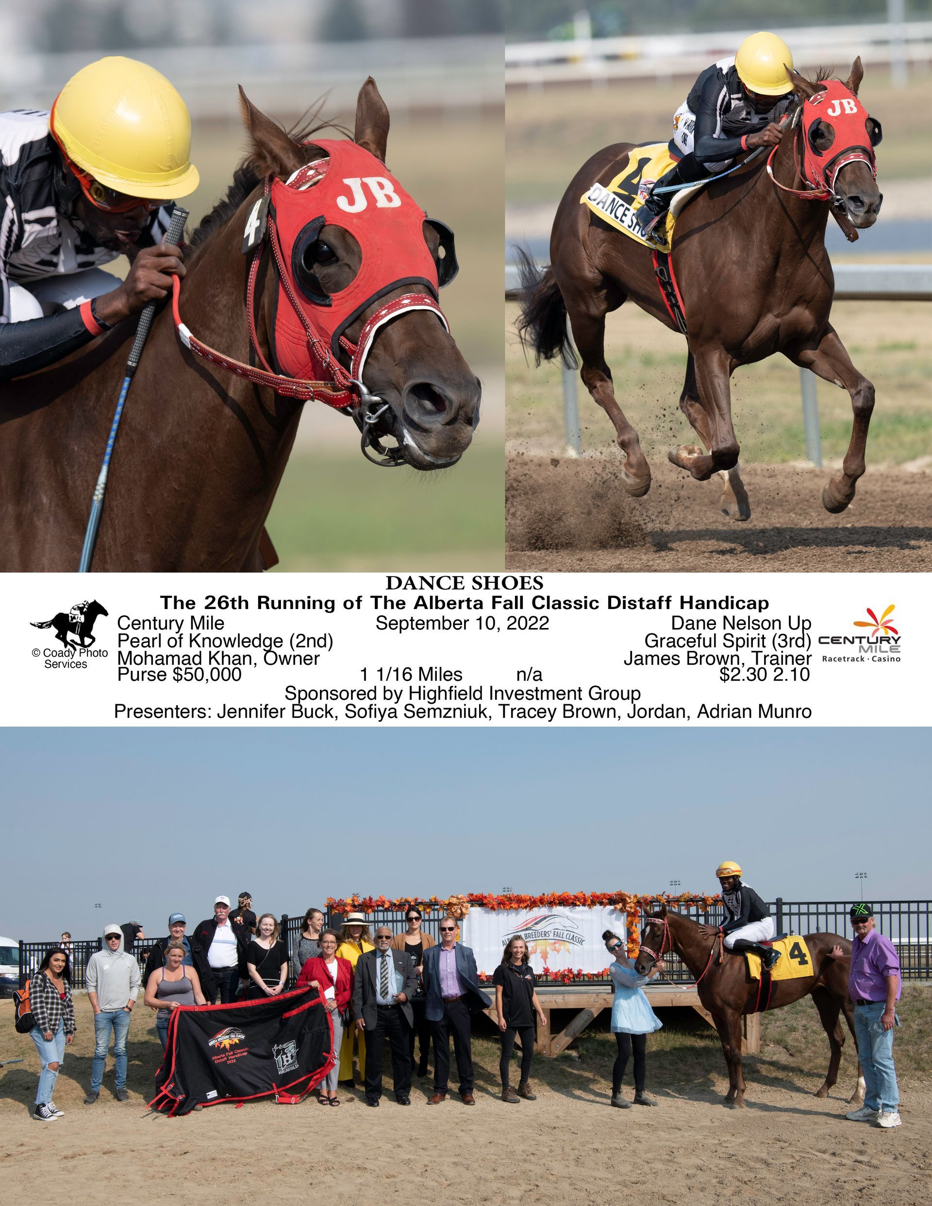 Owned by Mohamad Khan, bred by Jim McFadyen and trained by Jim Brown, the race for aged fillies and mares was Dance Shoes’ fourth win in her last five starts interrupted only by an inexplicable last-place finish in the August 20 Northlands Distaff.