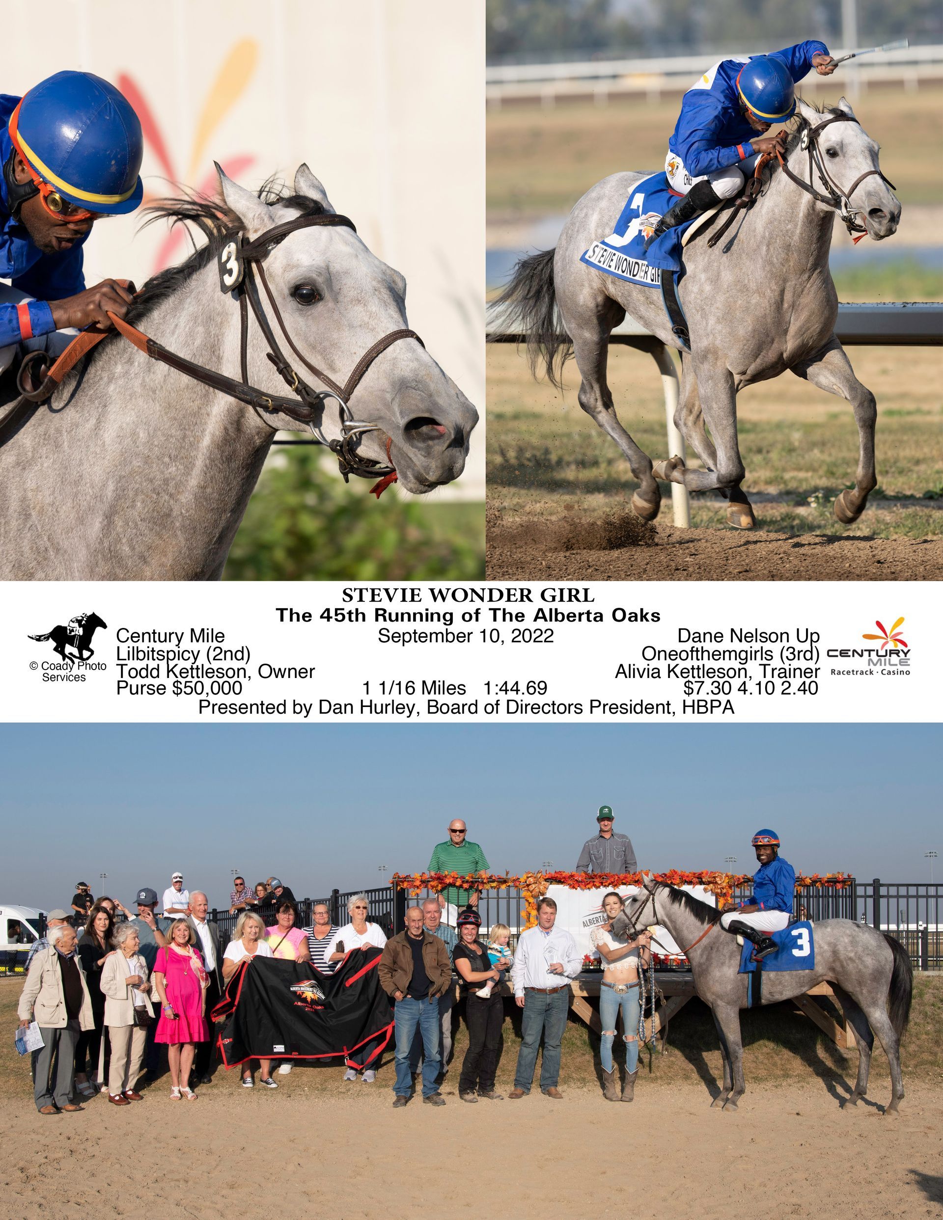 Stevie Wonder Girl gave trainer Alivia Kettleson her first stakes victory when the three-year-old filly sat third behind the speed of 28-1 long shot The River Grey and even-money favourite Oneofthemgirls, who had won five in a row, before unleashing her talent down the stretch.